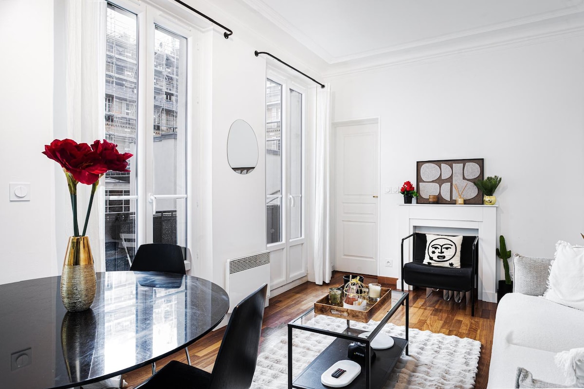 This charming large one-bedroom apartment in Pigalle/Rochechouart features a bright living room with original wooden floors, a fireplace, a comfy sofa bed and a double balcony that is perfect for morning croissants from the bakery below. The kitchen is well-equipped, and the bathroom includes a bathtub and rain shower. Located near Rue des Martyrs, Sacré-Cœur, and local cafes, it's literally steps away from supermarkets, a park, specialty coffee and Friday's Local Produce market at Anvers Square