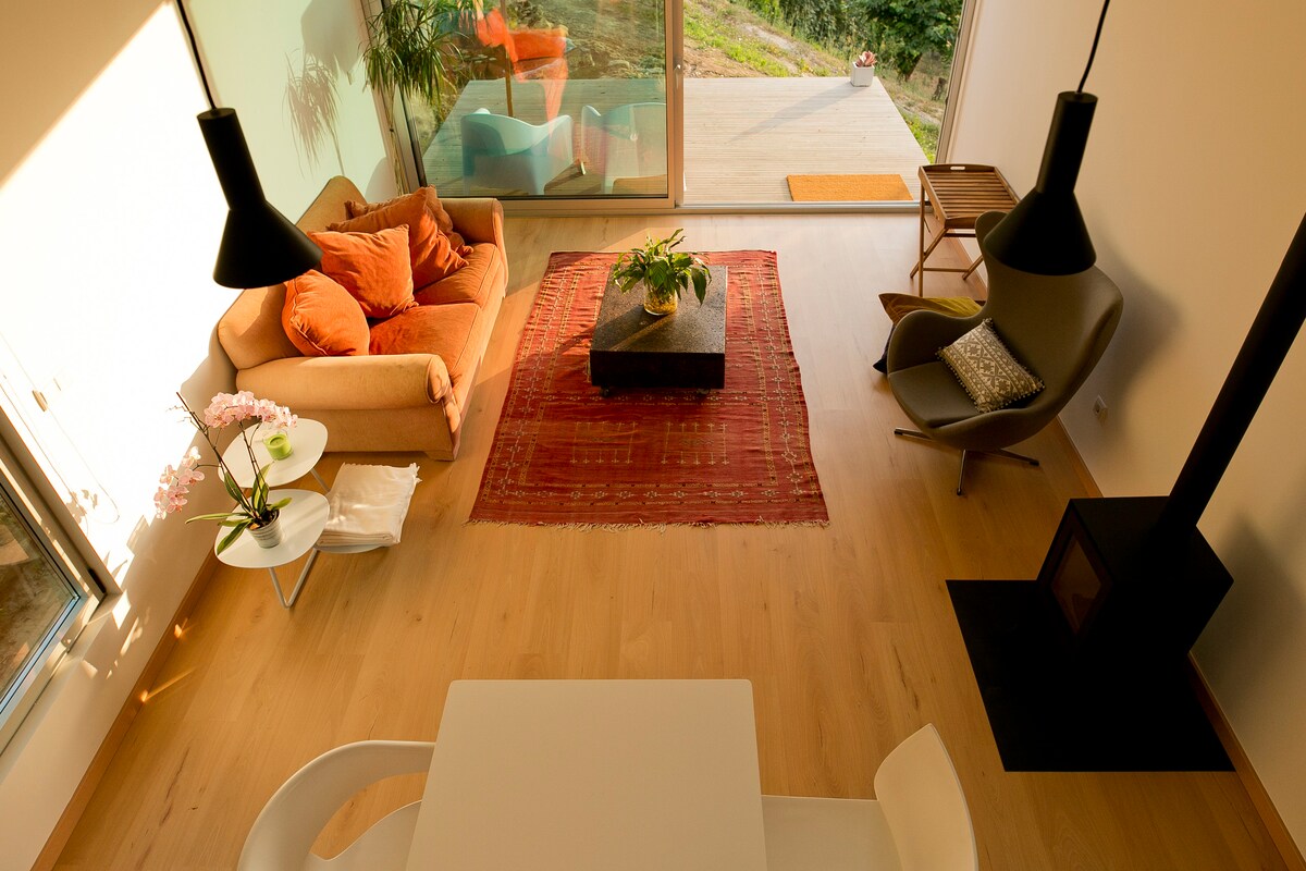 Pequena casa em madeira de 32 m2 , arquitectura moderna de linhas direitas , interior simples e funcional com muita luz. Totalmente equipada para 2 pessoas com uma cama de casal numa mezanine com vista para o mar. Possui um deck exterior que está semi suspenso sobre o jardim.