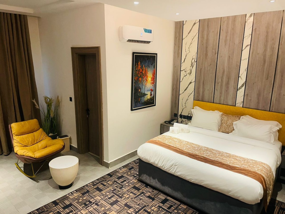 🗸Complimentary breakfast, welcome drink and premium bottled water 🗸Plush bed with crisp linens 🗸In-room safe 🗸Convenient bedside charging & nightstands 🗸High-speed Wi-Fi 🗸Enhanced bathroom amenities {Bathrobe and luxury slippers} 🗸Access to indoor hotel, bar and shared lounge 🗸Minutes from the city centre, major freeways, and the airport 🗸Close to Abuja National Mosque, National Christian Centre, Yar’Adua Centre, art venues, and Jabi Lake Mall 🗸Children under 13 stay free. Book Now!
