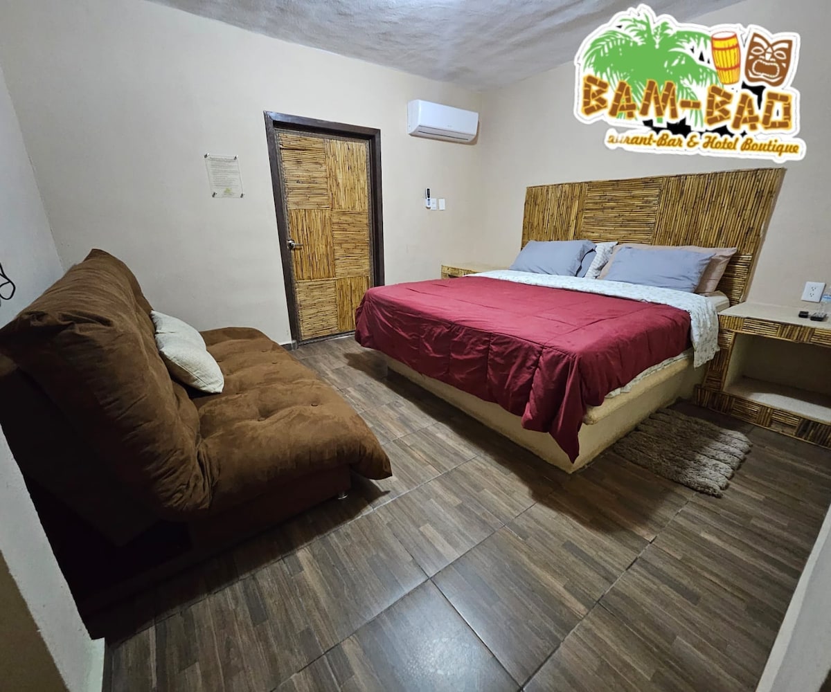 Nuestra habitación sencilla cuenta con 1 cama matrimonial para máximo 2 personas. Puede tener vista a la alberca, pasillos o la avenida. La decoración y distribución del mobiliario puede cambiar en las habitaciones de las misma categorías.