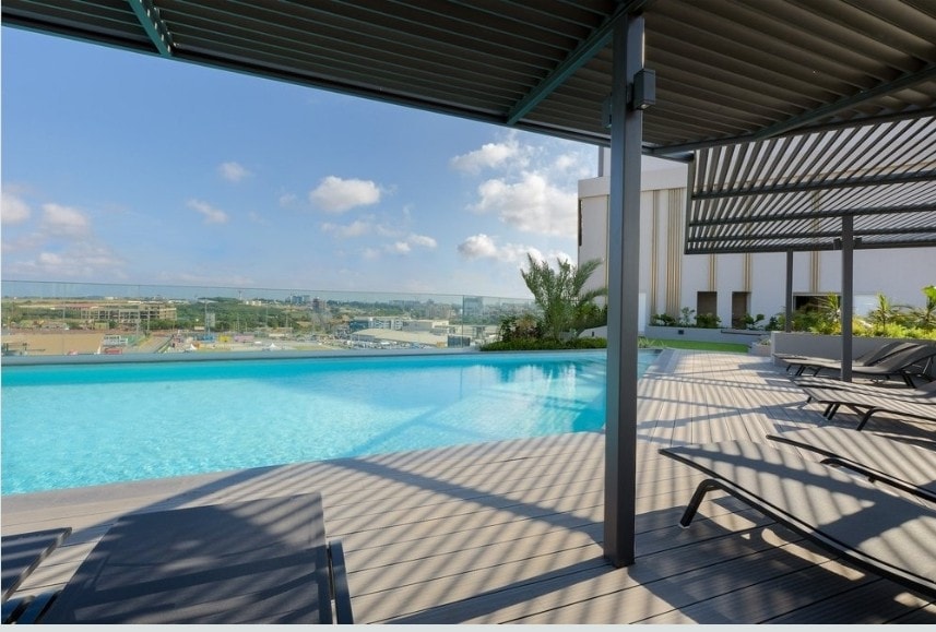 Acogedor 1BR en East Legon con balcón y piscina en la azotea