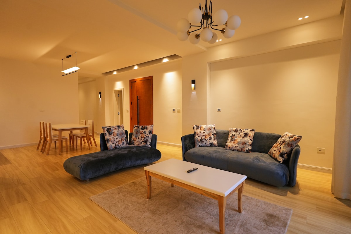 Disfruta del lujo y la comodidad a pocos pasos del aeropuerto internacional de Bole en este impresionante apartamento de 3 dormitorios y 2 baños en el barrio más prestigioso de Bole, junto al Ethiopian Airlines Skylight Hotel. A los huéspedes les encanta el balcón con impresionantes vistas a la ciudad, los elegantes interiores, la cocina totalmente equipada, el wifi, la lavadora, el servicio de limpieza semanal y el generador de respaldo. Rodeado de los mejores cafés, restaurantes y tiendas, es seguro, perfecto para familias, grupos o viajeros de negocios. 4.º piso, sin ascensor