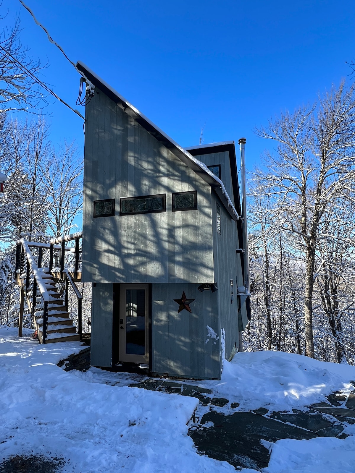 Casa rural privada en Charlotte, VT, con sauna de cedro, ventanas de 3 metros y vistas al bosque. A solo 2 minutos del monte Senderismo en Philo, a 8 minutos del lago Champlain y a 20 minutos de Burlington, cultura y UVM; a 30 minutos de Middlebury College. Perfecto para parejas o viajeros solos que buscan una escapada romántica o un acogedor refugio invernal. ¿Buscas una estadía larga? Ofrecemos descuentos generosos para estancias semanales o de 28 días o más, perfectas para trabajar a distancia, trasladarse o viajar durante más tiempo.