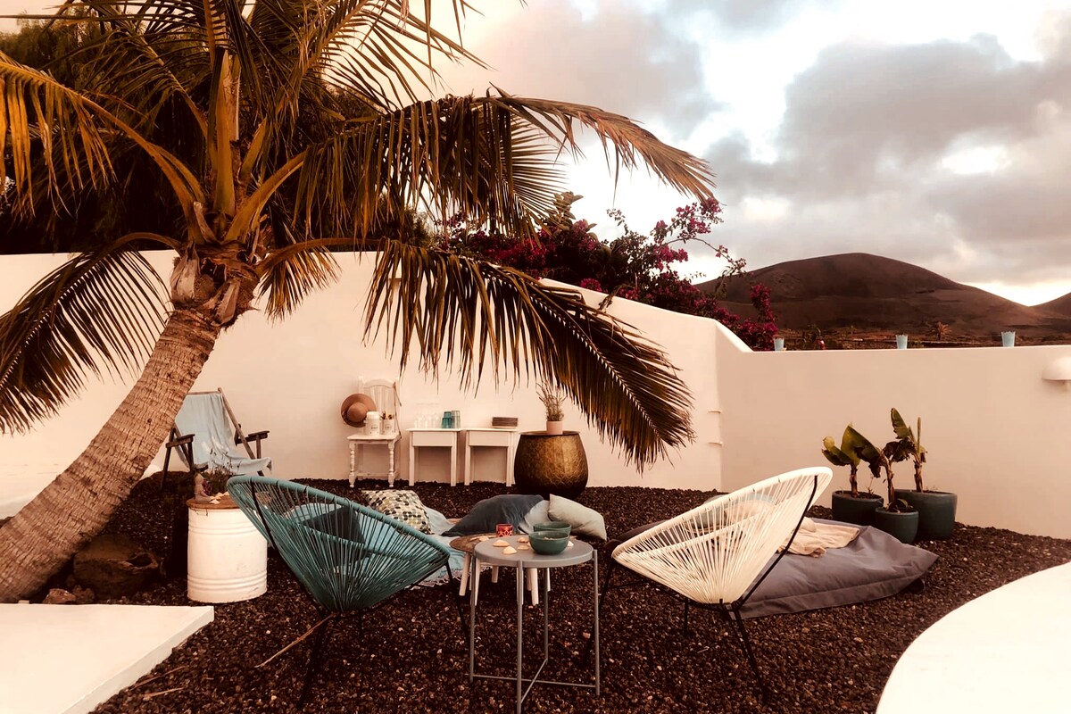Alójate en uno de los dos encantadores apartamentos hippies modernos de 80 metros cuadrados con una vista única del Parque Nacional de Timanfaya y sus volcanes. El apartamento cuenta con una cocina totalmente equipada, una sala de estar con puertas correderas panorámicas y un sofá cama, TV de alta definición, internet de fibra óptica y un dormitorio con baño privado de estilo canario. Relájate en tu terraza privada, sumérgete en la piscina de agua salada César Manrique, disfruta de las vistas infinitas y maravíllate con las puestas de sol mágicas. 🩵