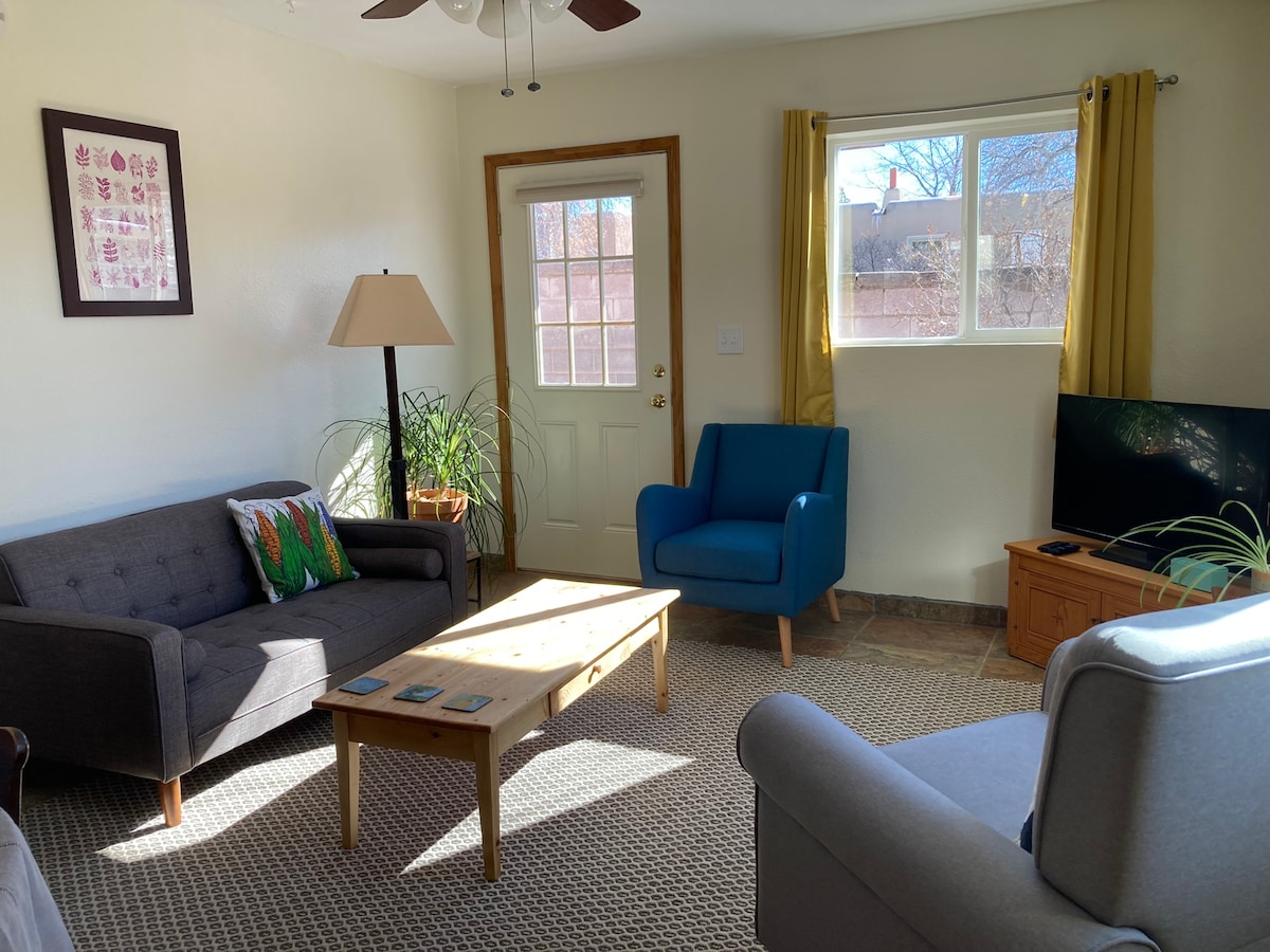 Welcome to Santa Fe! This charming studio cottage and my home share the property in this quiet residential neighborhood. The cottage is full of Santa Fe charm with a cozy, pretty interior, skylights and lots of natural light, a fully-stocked kitchen corner, handmade cabinets, Mexican tile, one comfy queen-sized bed, and a private garden patio. It's a quiet haven but centrally located, just 2 miles from the Plaza/downtown. It's a lovely place for couples, solo adventurers, and business travelers.