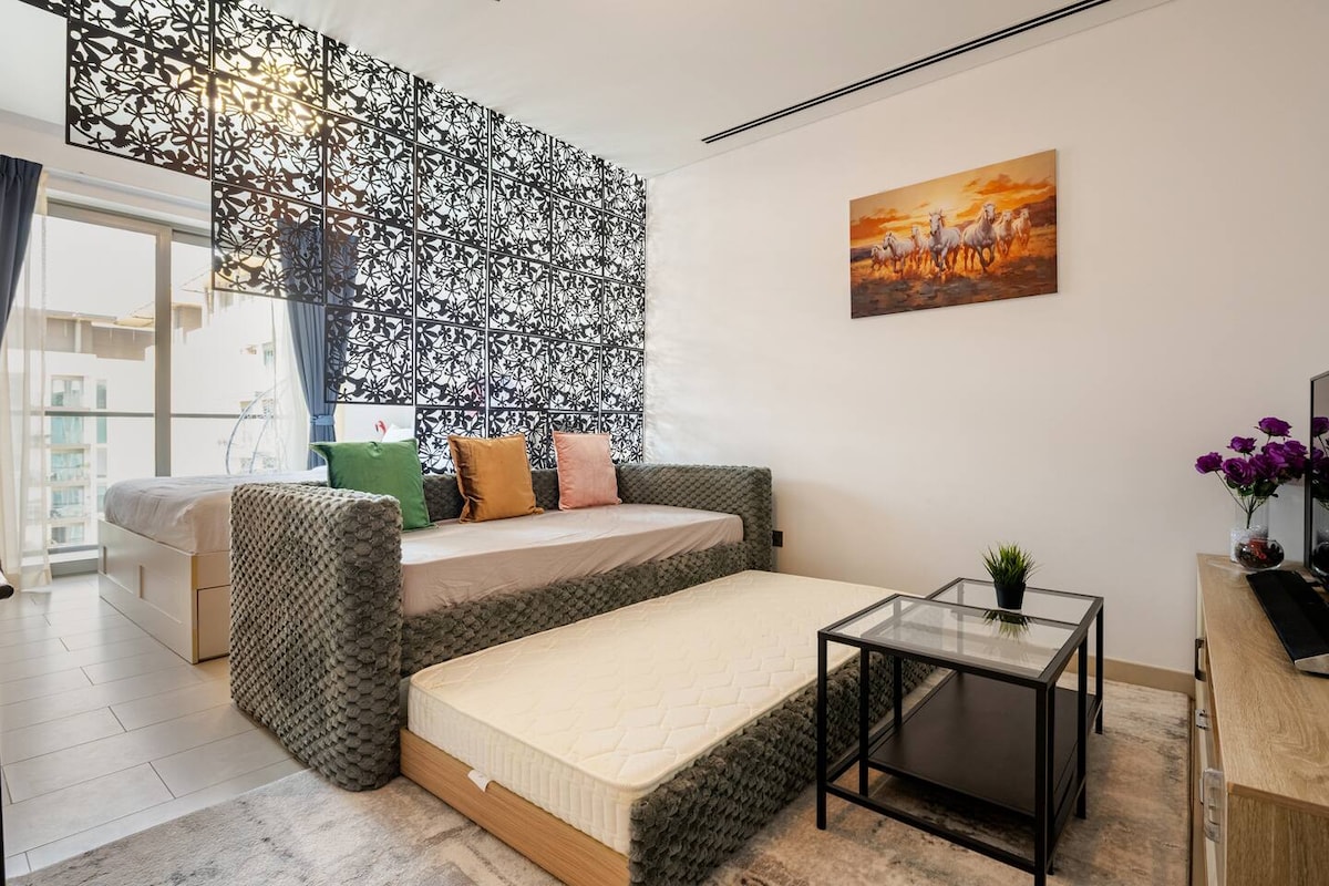 Te damos la bienvenida al Boutique Studio by Blue Cloud Holidays, un nuevo apartamento tipo estudio en Al Mamsha, Sharjah. Este nuevo apartamento ofrece una comodidad y comodidad incomparables. Disfruta de un acceso rápido al aeropuerto de Sharjah (10 minutos) y al aeropuerto de Dubái (20 minutos). Disfruta de servicios de primera calidad, como una cocina totalmente equipada, wifi de alta velocidad y acceso a la piscina. Nuestra máxima prioridad es la limpieza, lo que garantiza un espacio fresco y acogedor para tu estancia. Experimenta la vida de lujo en el corazón de Sharjah