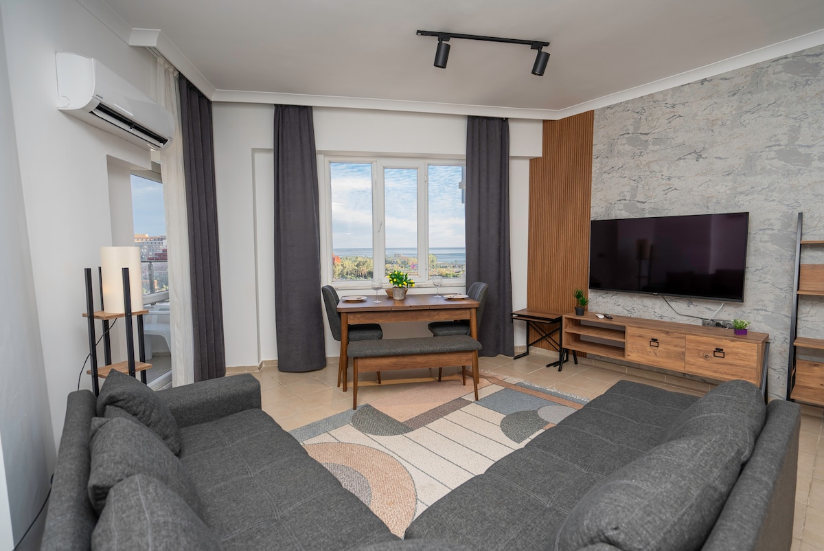 Enjoy a cozy stay in this panoramic sea and mountain view apartment, perfectly located in the heart of the city yet peacefully quiet. The building has an elevator for easy access. Beaches, shopping malls, nightlife spots, and historic landmarks are all within walking distance. Wake up to stunning views, relax with breathtaking sunsets, and feel at home while exploring everything the city has to offer. Ideal for couples, families or solo travelers seeking comfort, scenery, and convenience.