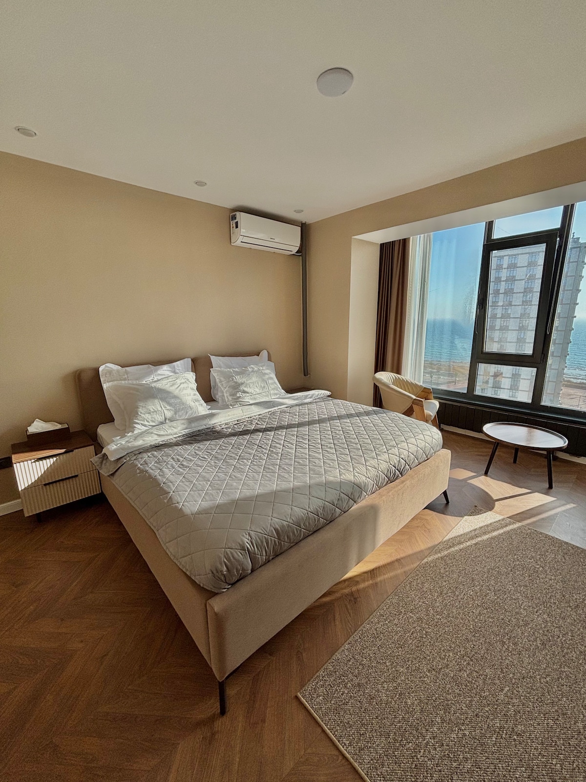 departamento renovado de diseño con vistas al mar en el centro de la ciudad. El apartamento cuenta con todo lo que necesitas para una estancia cómoda y relajación. Dormitorio con vista al mar, elegante y cómoda cama tamaño king. La ubicación está en el centro de la ciudad junto al mar, en la casa en las plantas inferiores hay cafeterías, restaurante Mint, supermercado Dana, panadería Bulka y más. Cerca hay centros comerciales, tiendas, farmacias, restaurantes, parque de entretenimiento, terraplén. La casa no es un edificio nuevo. Hay un depósito de 10,000 tenge