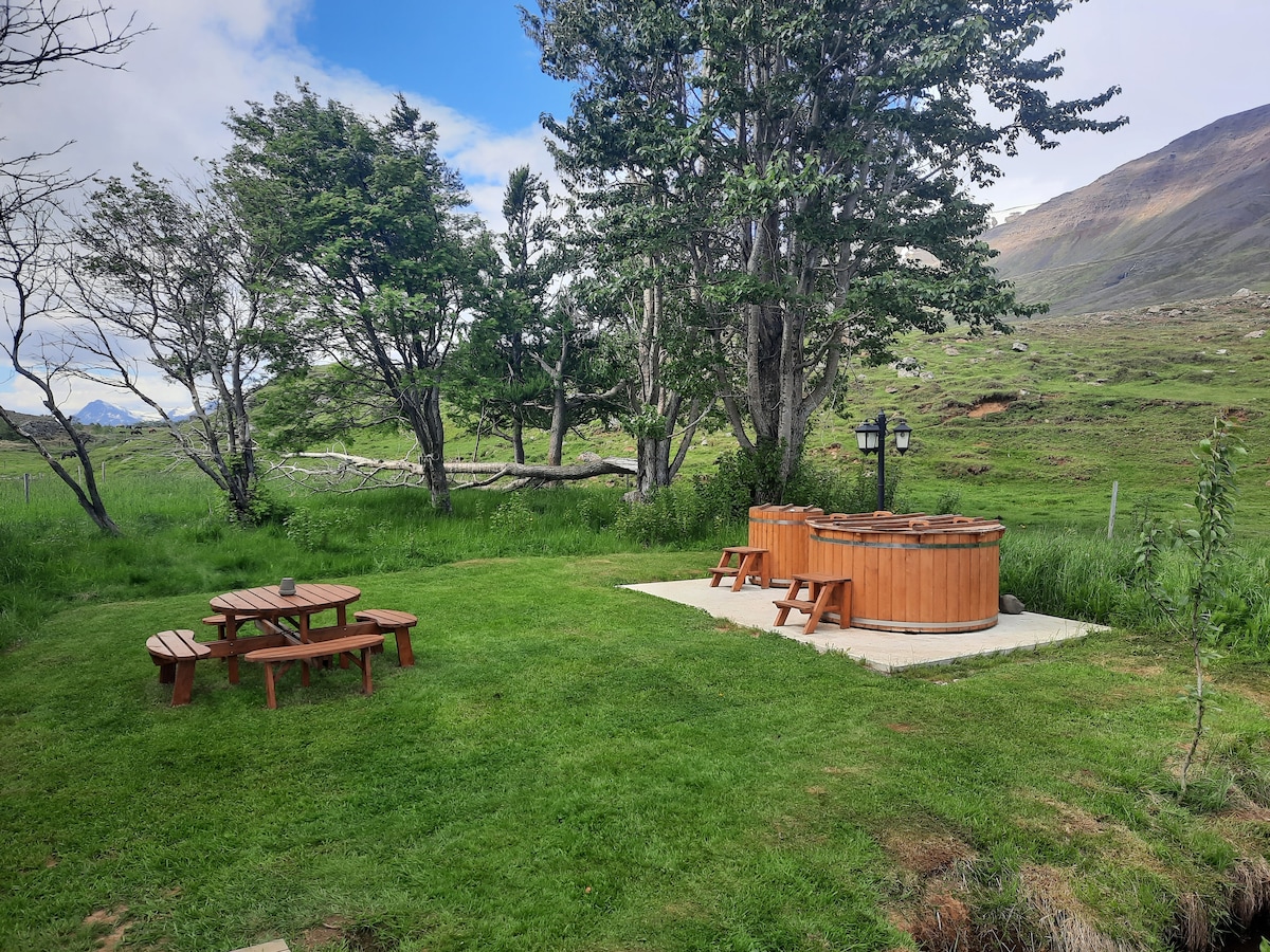 El apartamento A ofrece tranquilidad, privacidad y unas vistas impresionantes de nuestra tranquila granja islandesa. Relájate en el jacuzzi geotérmico compartido y en la piscina de agua fría, rodeado de naturaleza pura y aire fresco de montaña. En las noches despejadas de invierno, es posible que veas la aurora boreal y disfrutes de las aguas cristalinas que fluyen directamente desde nuestra montaña, Staðarhnjúkur. A 10 minutos en coche de Akureyri y de muchas actividades cercanas. Está viendo el apartamento A a la izquierda.