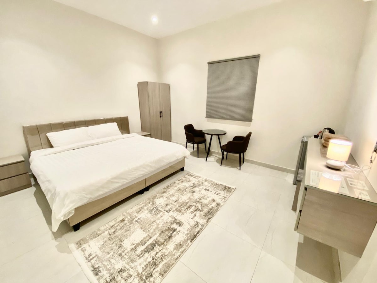 Una habitación moderna, en el corazón de Medina, que puede alojar a sus visitantes, que consta de una cama real, aseos integrados, equipada con todas las necesidades de cuidado personal, una pantalla de televisión inteligente con múltiples canales y wifi No solo eso, como ya te hemos acostumbrado, estamos aquí para celebrar cada momento contigo a través de la hospitalidad gratuita y el servicio al cliente 24/7, para hacer de tu estancia una experiencia inolvidable.