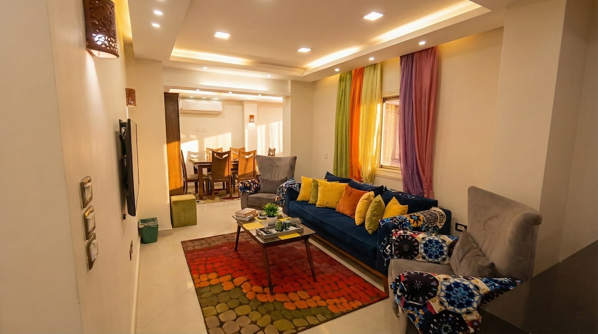 This brand-new, spotless apartment is perfectly located just 5 minutes from the Pyramids gates and 10 minutes from the Grand Egyptian Museum. The modern space features air conditioning, high-speed WiFi, and all essential amenities with fresh linens and towels. Everything is pristine as new construction. Restaurants, cafes, nightlife, shops, and pharmacies are within walking distance, while Mall of Egypt is 10-15 minutes by Uber. Ideal for travelers seeking comfort and convenience.