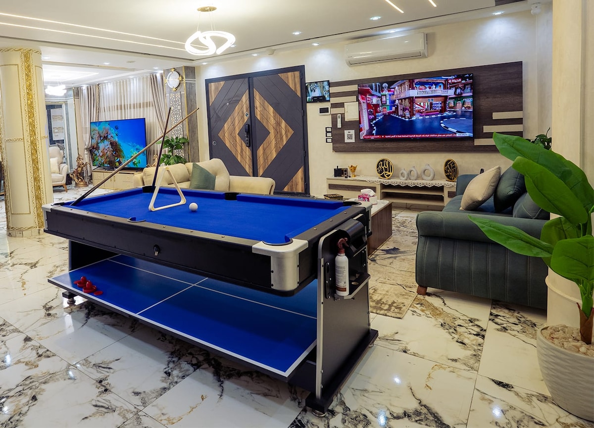 استمتع مع كامل العائلة في هذا المسكن الأنيق. مساحة واسعة ٤ غرف نوم طابقين ٣ حمامات تكييف، خزنة مجففات شعر، سرير وكرسي اطفال، شاشات ذكية، كاميرا مراقبة، wifi، اقفال ابواب ذكية،طاولة بلياردو هوكي وتنس ، مطبخ كامل المعدات ، ماكينة قهوة ،اثاث متكامل سوبر ديلوكس، مكتب ولابتوب ، معدات رياضية، مسبح، قريب من السوق التجاري، مراكز التسلية قرب ١ كم من المتحف الجديد والأهرامات، بالقرب من الصراف الآلي مشفى، صيدلية ، سوبر ماركت، مقاهي...