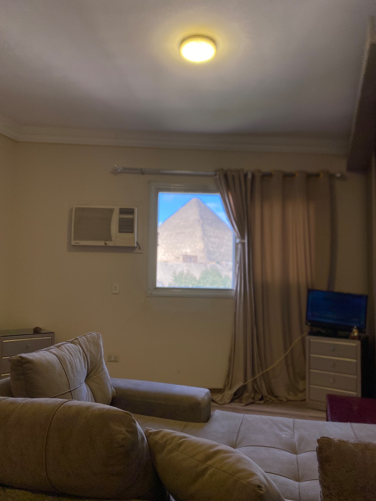 Despiértate con una vista impresionante y directa de las pirámides en esta cálida habitación cuidadosamente diseñada por PLACES. Disfruta de la luz natural suave, los interiores minimalistas y un ambiente tranquilo hecho para mañanas lentas y noches tranquilas. Los huéspedes también tienen acceso a nuestra azotea, que ofrece una vista panorámica ininterrumpida de las pirámides, perfecta para momentos al atardecer y fotos inolvidables.