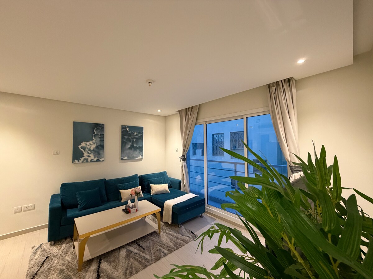 Un cálido apartamento contemporáneo de 2 dormitorios en un edificio orientado a la familia con personal acogedor, servicio de limpieza y servicio de recepción y seguridad las 24 horas. Apto para niños y bebés. A 3 minutos a pie llegarás directamente a cafeterías internacionales, restaurantes, supermercados 24 horas, pista de pádel y mucho más cuando te hospedes en este alojamiento céntrico en el corazón (Busaiteen). A 5 minutos en coche de The Avenues, a 10 minutos en coche del aeropuerto y a 10 minutos en coche del centro de Manama.