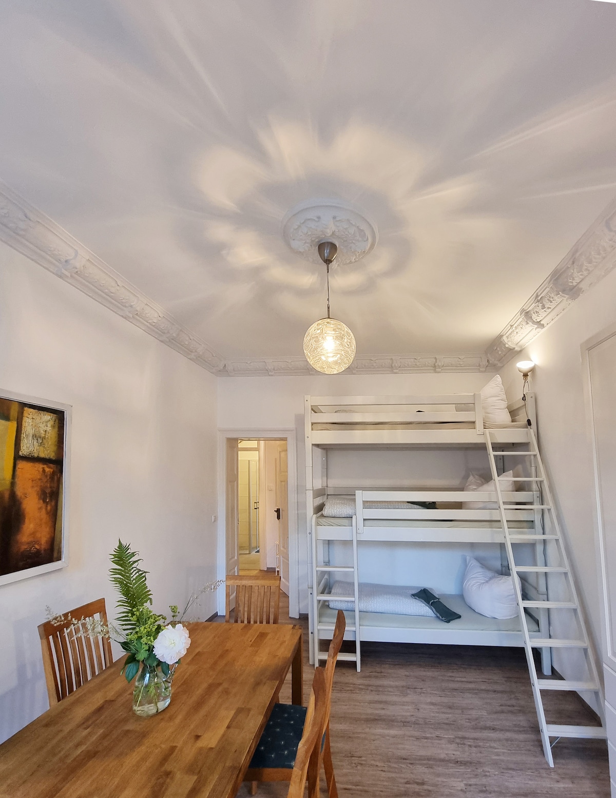 Nuestra SACHSENPERLE se encuentra en el animado barrio de Dresden Neustadt, justo enfrente del Alaunpark, no muy lejos del Kunsthof, y ocupa todo el tercer piso de una hermosa casa de estilo wilhelminiano. En 90 metros cuadrados, le rodea una mezcla de estilos de antigüedades e iconos de diseño desde el barroco hasta la actualidad. El corazón del apartamento es la sala de estar de 45 metros cuadrados con suelos de roble, cocina abierta y barra. Una carpeta con nuestros consejos y aspectos destacados en las inmediaciones está disponible para usted.