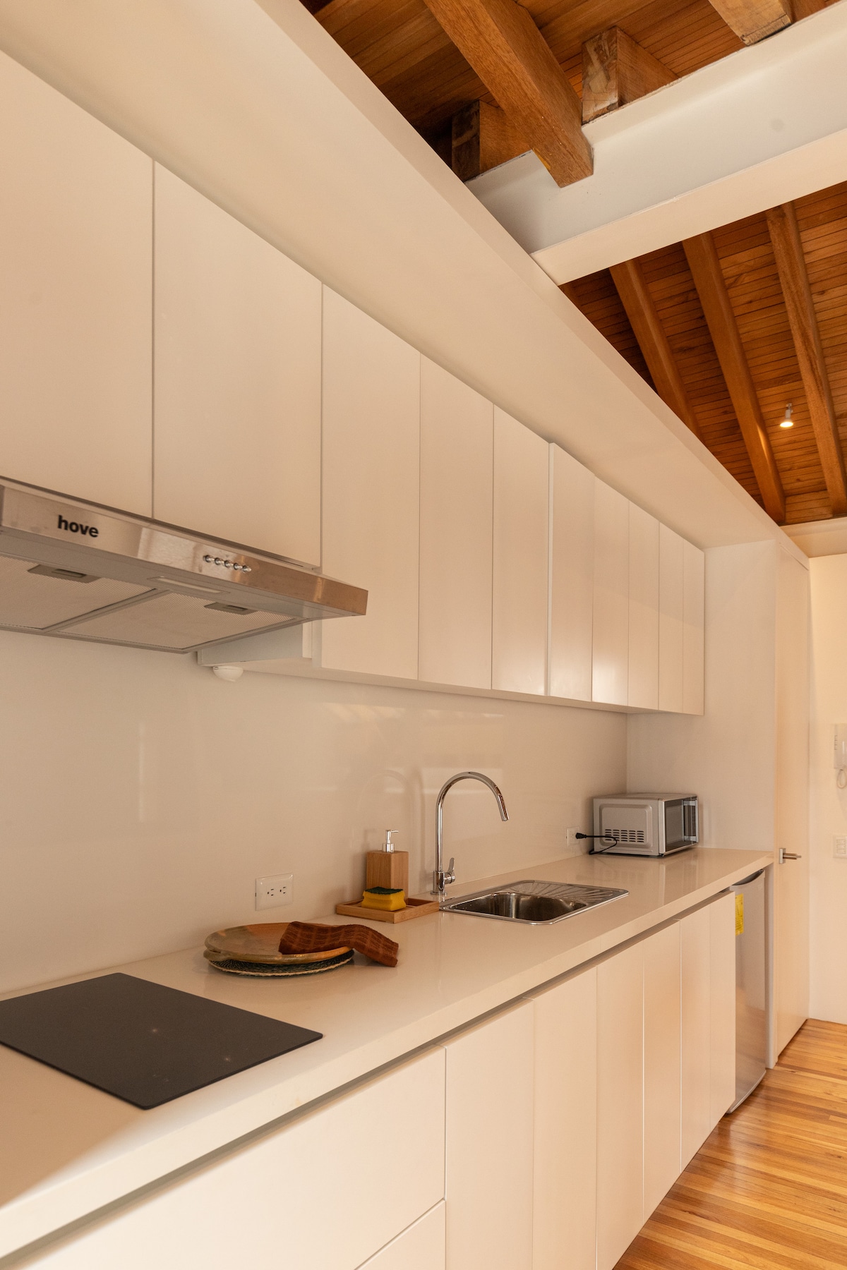 Absorba la relajante luz y calidez que penetra todo el espacioso ambiente a travez de las grandes ventanas y tragaluces. Relájate debajo de unos amplios cielos raso de 3 metros en las habitaciones y uno abovedado de 6 metros en la cocina abierta estilo americano. ⚡️ agua caliente, Wi-Fi y luz para tus dispositivos las 24/7 gracias al sistema de baterías de respaldo. Ojo: algunos electrodomésticos de alto consumo, cómo el secador de pelo y la tetera, no funcionan durante los cortes de energía.