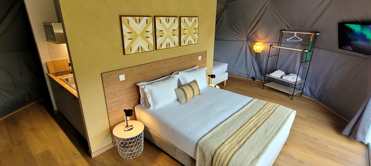 Os nossos DOMOS TRIPLO têm todas as condições para proporcionar umas férias relaxadas no meio da natureza. São constituídos por uma cama de casal e uma cama de solteiro, com uma pequena kitchenette equipada, mesa de refeições, casa de banho e terraço panorâmico. Tendo ainda acesso livre a todos os espaços comuns: - Bar - Piscina - Sauna - Yoga dome. Desfrute do cenário encantador deste espaço na natureza.