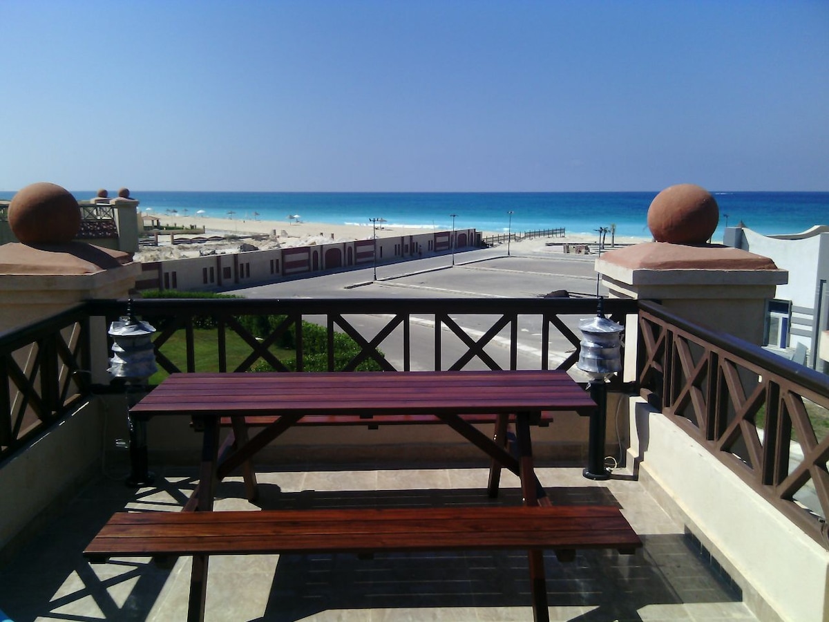 Chalet totalmente amueblado frente a la playa con una vista directa al mar en una de las mejores playas de arena blanca de Egipto. Balcón delantero grande con vistas soleadas al mar (puedes disfrutar del bronceado y relajarte a la luz del sol en la privacidad). Habitaciones totalmente climatizadas con un espacio de vida común espacioso/soleado. Muy adecuado para vacaciones en familia, reuniones grupales y personas que buscan un tiempo tranquilo lejos de la ciudad.