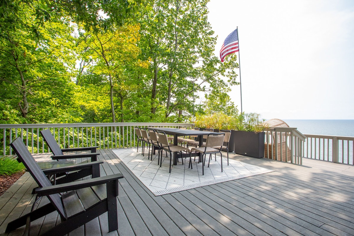 Con el lago Míchigan en tu patio trasero, esta casa de 5 dormitorios y 3 baños te sorprenderá con sus interminables vistas al lago. Disfruta de hermosas puestas de sol desde el enorme patio trasero situado en un acantilado pintoresco. Con más de 3100 pies cuadrados, la casa incluye 1 dormitorio king y 3 dormitorios queen, 2 literas, 2 camas para niños pequeños y un corralito. Las comodidades incluyen internet Starlink de alta velocidad, patios amueblados y cenador, solarium, toldos controlados a distancia, ducha exterior, sala de recreo con piscina/mesa de ping pong, aire acondicionado, 2 lavadoras/secadoras, parrilla y chimenea.
