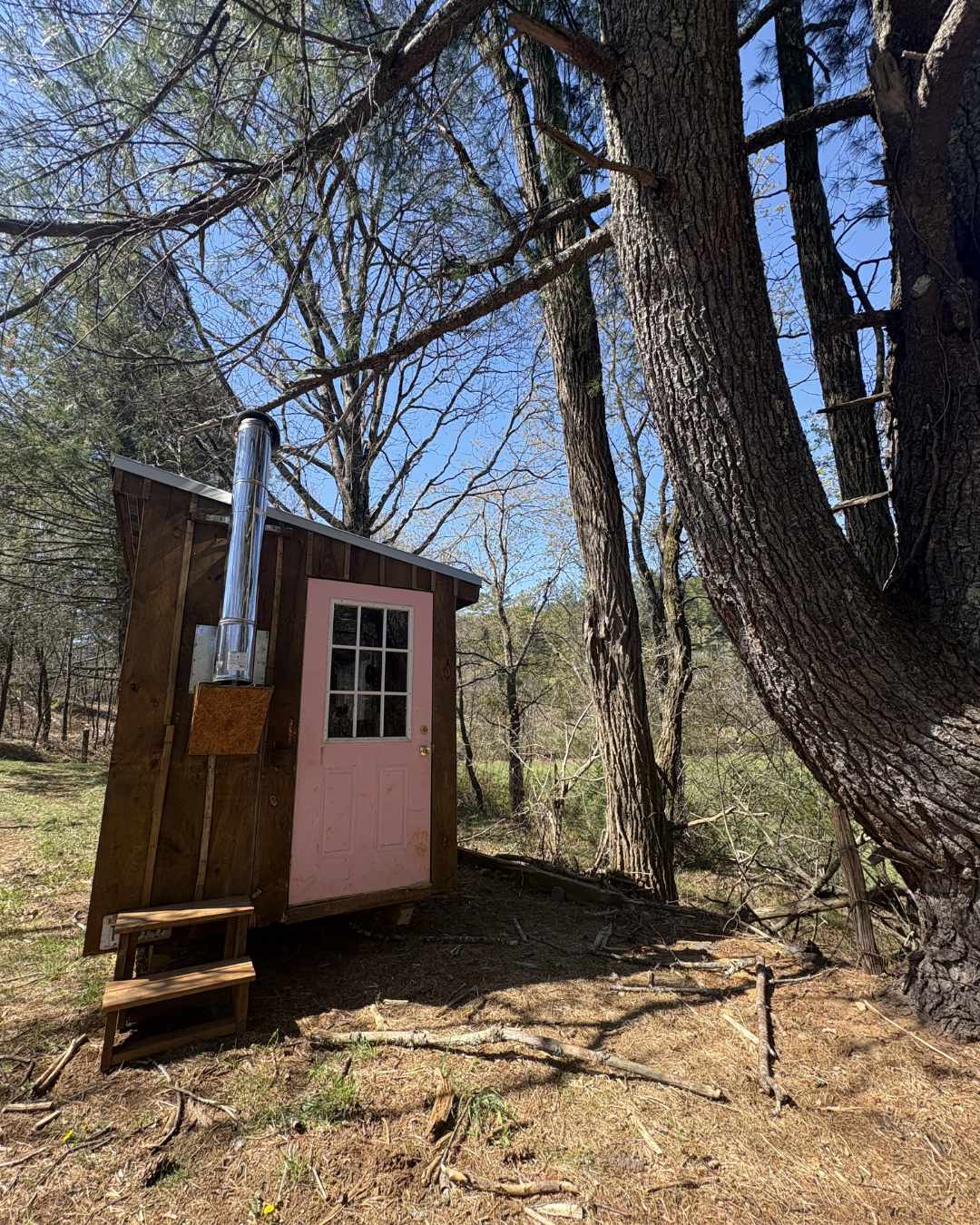 Estudio en una casa del árbol de 7,3 × 7,3 metros construido a mano con pino del lugar y madera de granero recuperada. Dos camas tamaño queen, una bañera vintage con patas de garra junto a un ventanal y una pared completa de cristal que enmarca el bosque y las puestas de sol nocturnas de Blue Ridge. Acogedora estufa de leña, wifi fiable y una cocina pequeña ordenada con nevera, vitrocerámica y microondas. Las sábanas de hotel, las toallas de felpa y los detalles artísticos crean un refugio de ensueño para un máximo de cuatro huéspedes. Se admiten perros.