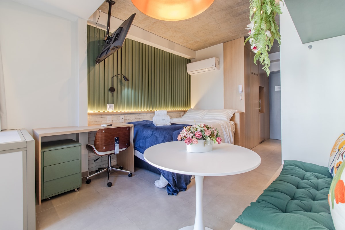 Boutique studio with one of the most beautiful views of São Paulo city. Placed 2 minutes walk from the subway. Fully equipped kitchen with refrigerator hidden by wooden door. Wi-fi, air-conditioning and smart TV 55 inches. Self check-in with smart electronic lock. Play tennis or go o gym and relax in the pools (outdoor or heated indoor) and saunas (wet or dry) afterwards. Common area also includes co-working spaces and laundry. Visitors need to be previously registered at the front dest.