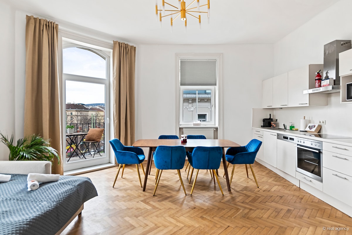Este apartamento se encuentra en una de las mejores y más modernas zonas de Viena (Servitenviertel) y representa un típico apartamento vienés en un Palais (por ejemplo, techos espaciosos, altos y estucados, interiores elegantes y modernos, lámparas de araña de cristal originales, balcón, piano). Todas las habitaciones están decoradas con mucho estilo y detalle, ya que los propietarios del apartamento son diseñadores de interiores. El apartamento también ha aparecido en Andrew Martins Design Review, los Óscar del diseño de interiores.