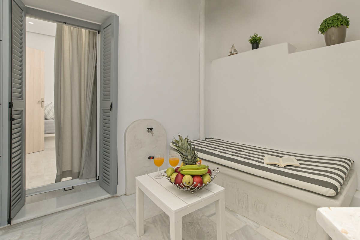 Construido alrededor de los arcos cicládicos llamados Camares, casi en la entrada del castillo, el estudio se encuentra en un barrio muy conocido que combina tanto la privacidad como la vida vibrante de restaurantes, bares de vinos y todo tipo de tiendas a pocos minutos a pie. El puerto y la playa también están muy cerca del apartamento, así como dos aparcamientos públicos. La suite cuenta con cama tamaño king, sofá cama, baño privado y terraza con vistas al mar y a la calle.