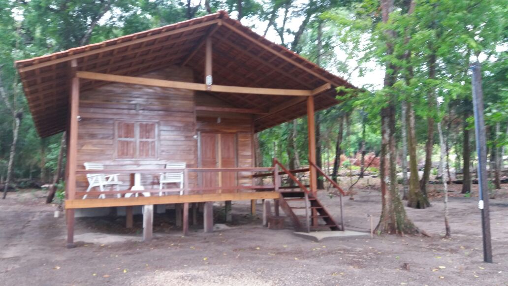 Chalet, con una suite equipada con una cama doble, una cama individual y otra hamaca. También tiene un armador en la cocina y varios afuera. El chalet es de madera noble, con baño de mampostería. Está ubicado frente a la fuente, la playa y el río Tapajós. Tiene aire acondicionado, cocina, nevera y TV.