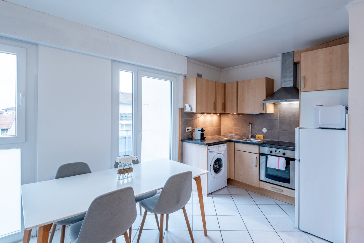 Luminoso apartamento de 2 habitaciones en Annemasse Vistas despejadas del Salève y el Mont Blanc desde la sala de estar. Sala de estar con gran ventanal y sofá cama para 2 personas, cocina abierta equipada, dormitorio con cama doble, baño moderno y WC separado. Muy cerca de tiendas, restaurantes y mercados locales. Tranvía a Ginebra al pie del edificio, estación de Annemasse a 7 min. a pie, y Ginebra accesible en 10 min. en coche. Ideal para descubrir Ginebra y su región, en un entorno moderno y práctico.