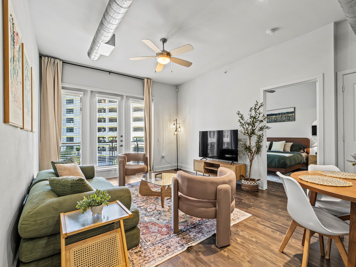 Enjoy a stylish experience with Downtown high-rise Views, close to all entertainment, restaurants, convention center, beauty centers, shopping areas and offices Public transportation, Uber/Lyft are highly available Access to gym, pool (may or may not be open)& outdoor spaces Balcony in the unit where you can enjoy yourself at any time of the day Free street parking or 8am to 5pm free in the building’s garage, paid parking garage very close.