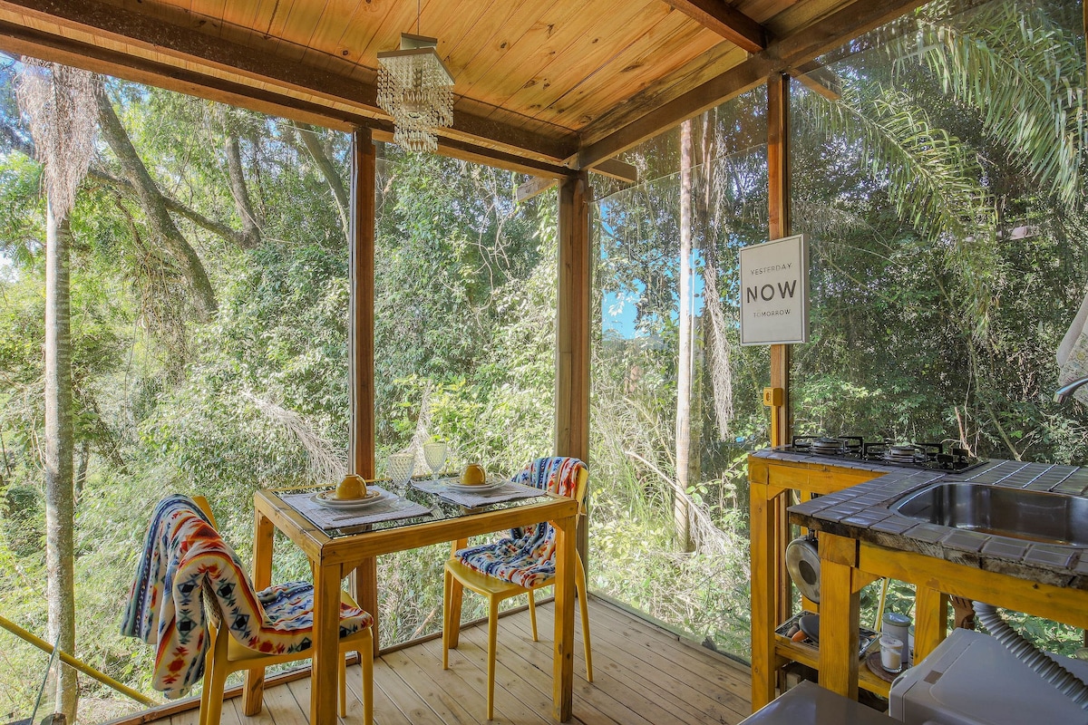 Relaxe neste lugar único e tranquilo. Casa inteira de vidros e rodeada de mata (estadia integrada à natureza, com conforto e romantismo). Sente na varanda aprecie o sol nascer. Pequena cozinha com utensílios. Acesso gratuito ao lago, caiaque, cascata, piscina, PetFriendly (pets dóceis c/ humanos e animais). Crianças > 13 anos Fogo de chão / churrasco de parrilla. Aqui habitam insetos e pequenos bichos. Alguns restaurantes entregam; temos um mini-mercado.