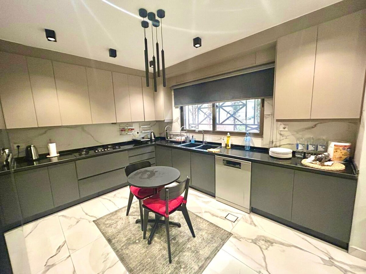 Elegant apartment in Fifth Circle near Fairmont Amman, in a prime and vibrant location close to restaurants and services. It features two comfortable bedrooms, a guest room, and a spacious living area with a dining table. The apartment includes two bathrooms and two private entrances. Enjoy two terraces, one with a fountain, both with outdoor seating. Fully equipped kitchen and stylish, comfortable furniture throughout.