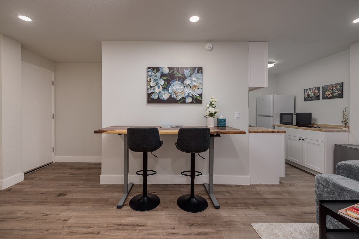 Pequeño apartamento de eficiencia ubicado sobre el garaje de una bonita casa ubicada a dos cuadras al sur del extremo oeste de Anchorage Park Strip. Entrada privada y espacio privado. Vista de las montañas de Chugach. A pie del centro o del sendero costero. Cama tamaño queen. Bañera de hidromasaje. Televisión por cable, Apple TV para streaming y wi-fi. Lavadora y secadora. Horno tostador, cafetera y nevera. Se proporcionan café y té. No tiene cocina completa.
