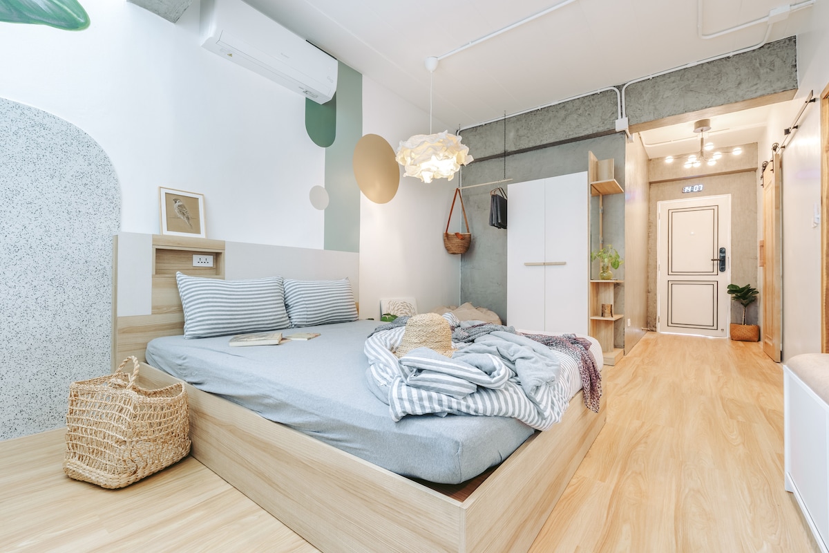 Our building, The Place Khaolak, is located near the main road in Khaolak with many parking spaces just in front. Your room is located on the 3rd floor of the building (we live on the 2nd floor) and the 1st floor is our surf & lifestyle shop and cafe. The space is very cozy and you will have your privacy with your own bathroom. There is a shared common space on the balcony where you can eat/drink/talk/share your stories with the best view of the mountain right in front of you.