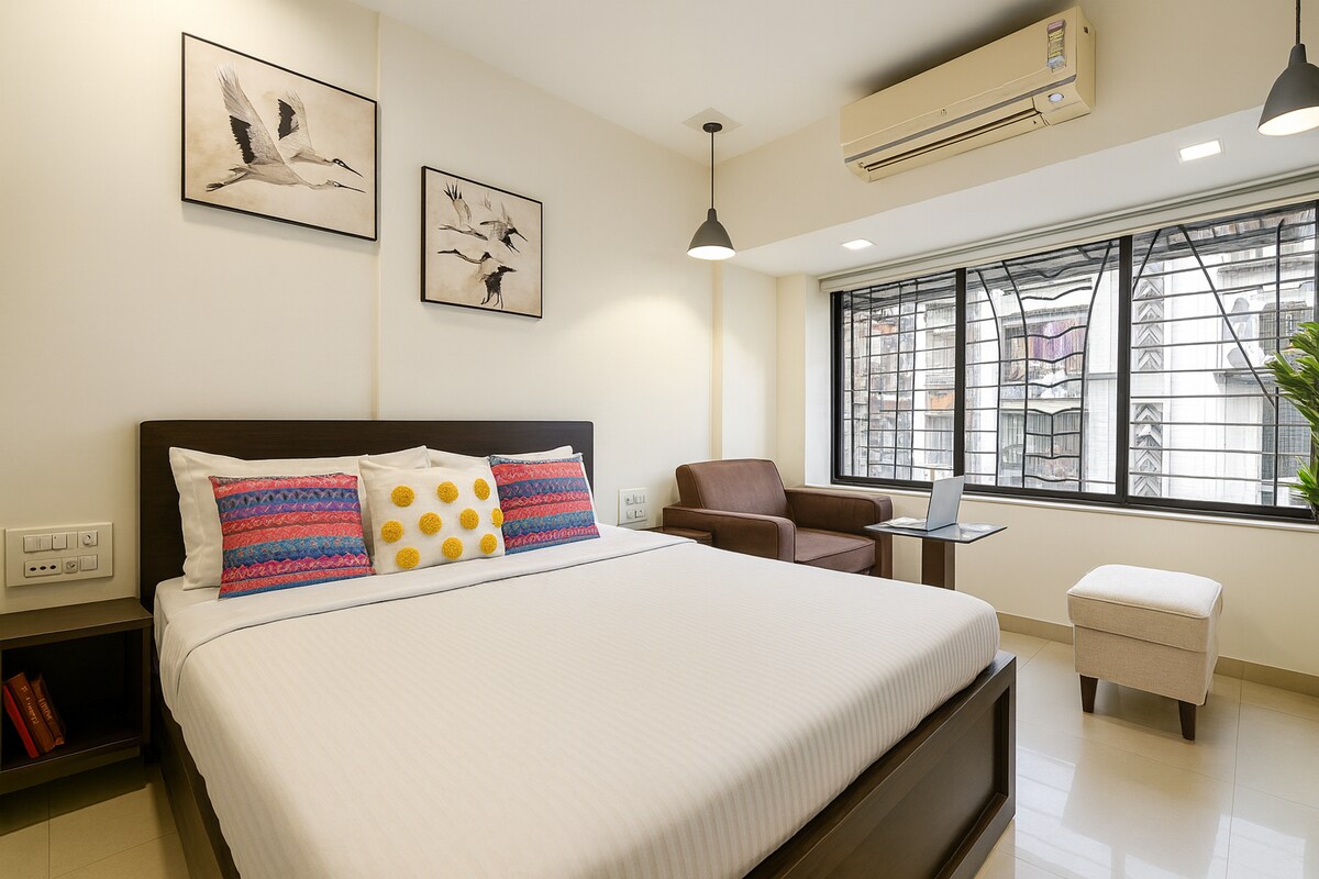 ¡Te damos la bienvenida a tu moderno retiro de un dormitorio en un apartamento de 1 dormitorio cerca de BKC! Con su diseño minimalista, amplio espacio de trabajo, opciones de entretenimiento y comodidades esenciales, ¡satisface las necesidades tanto de los viajeros de negocios como de placer! Características: ★ Mesa de trabajo grande ★ Wifi de alta velocidad gratuito Televisión ★ inteligente ★ Tata Sky con todos los canales de alta definición Barra ★ de sonido ★ Microondas/nevera ★ Freidora de aire ★ Purificador de aire ★ Purificador de agua ¡Reserva ahora y experimenta la combinación perfecta de modernidad y comodidad!