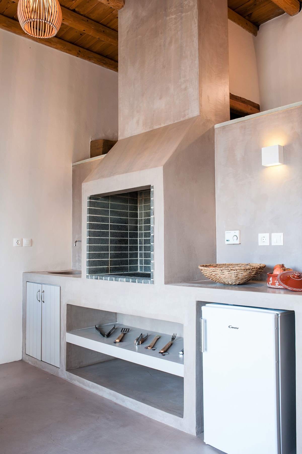 La unidad “Air” (Wind) es un edificio de piedra con paredes gruesas y las puertas de baja altura que sirvieron como residencia principal de la familia. Las características originales de la residencia se han conservado con la cama incorporada y la chimenea tradicional, mientras que se agregó una cocina moderna y un baño. El tamaño total de la unidad es de 41 m2. El alojamiento tiene un patio con espectaculares vistas al agua de la bahía de Korthi. Tiene una superficie interna de 41 m2.