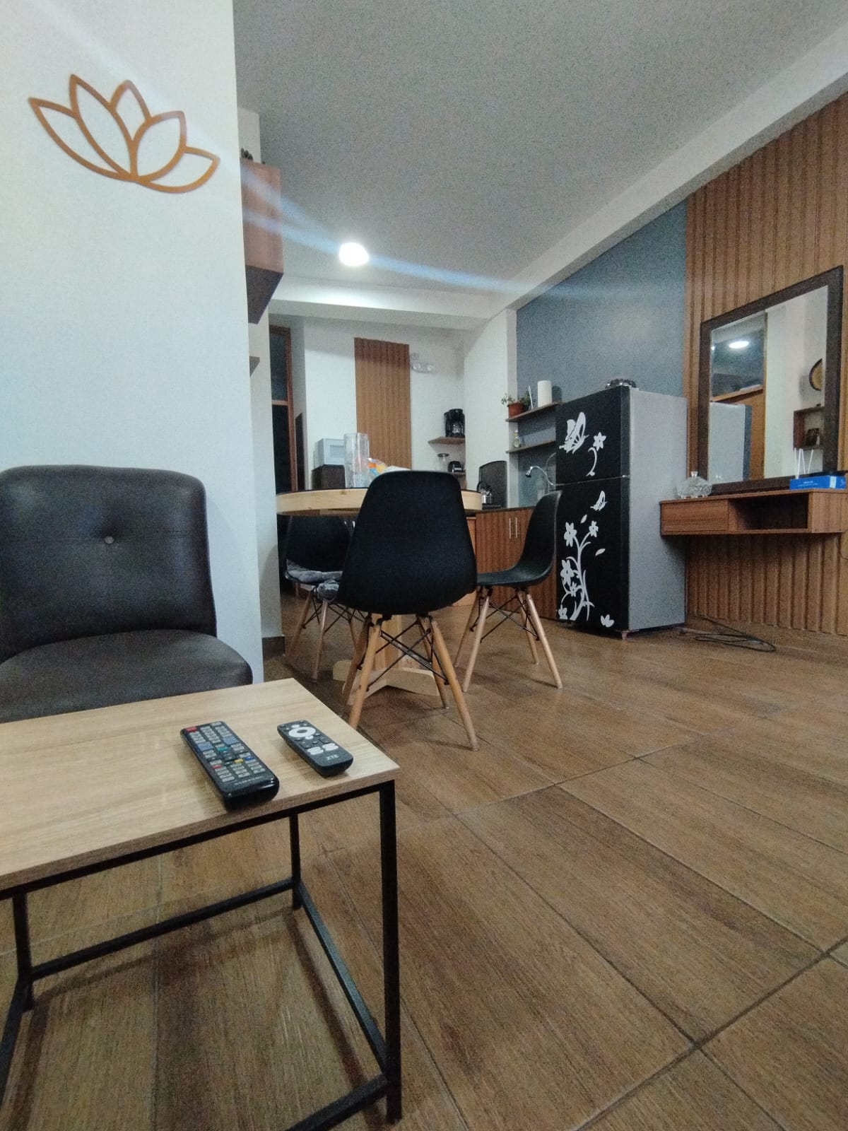 Un lindo minidepartamento en el primer piso, consta de una habitación, sala, comedor, cocineta y baño privado , tiene acabados modernos combinados con detalles de nuestra cultura, está amoblado con todo lo necesario para tener una estadía placentera, especial para parejas o persona sola.