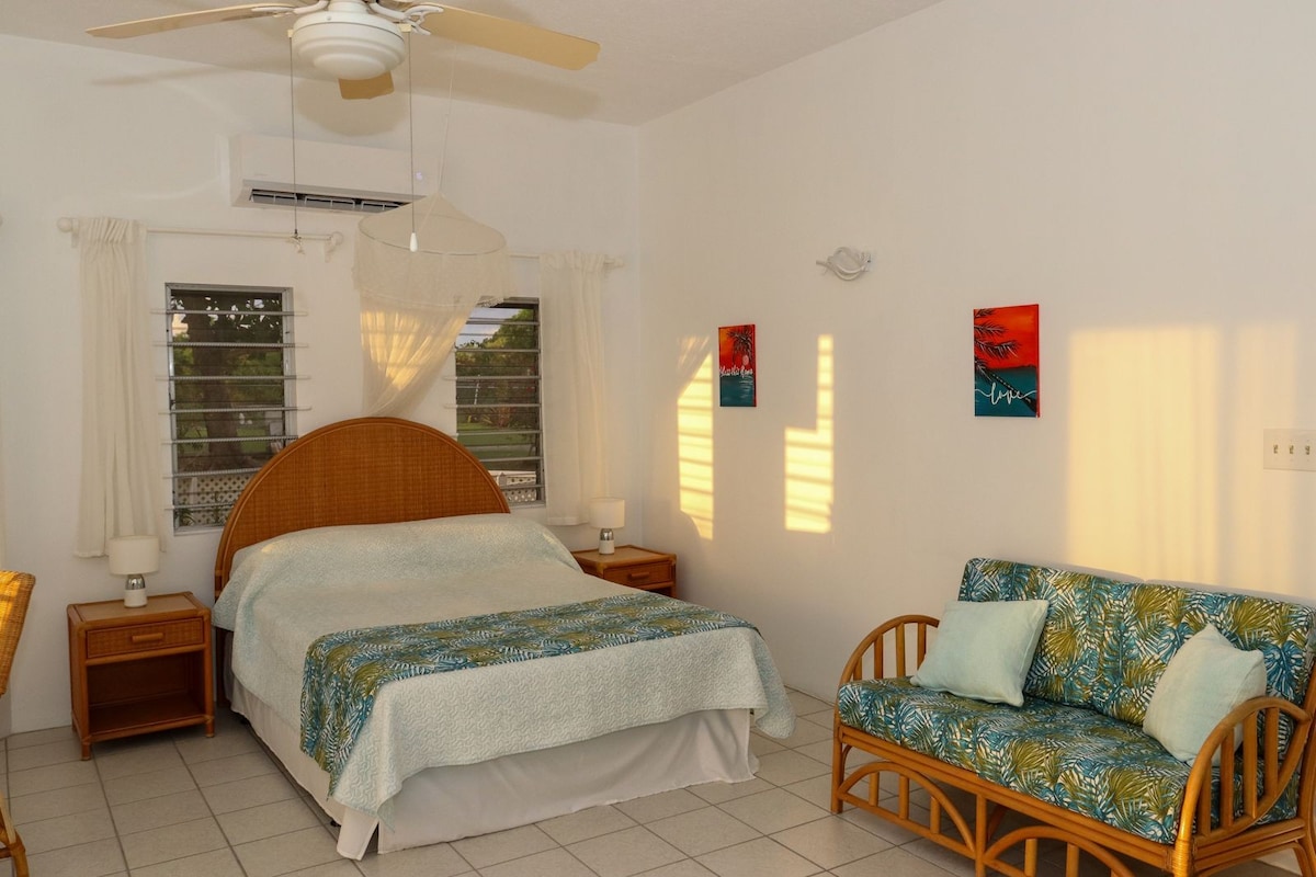 ¡Te damos la bienvenida a nuestro espacioso y acogedor apartamento estudio totalmente climatizado! 🏝️ Disfruta de la comodidad con una lujosa cama tamaño queen, un acogedor sofá de 2 plazas y una mesa de comedor para dos. 🛏️Prepara deliciosas comidas en la cocina totalmente equipada, completa con estufa/horno de tamaño completo, nevera, tostadora y hervidor de agua. 🍳 Refréscate en la espaciosa ducha del moderno baño. 🚿 En el exterior, sumérgete en las impresionantes puestas de sol desde el patio embaldosado con vistas a los exuberantes jardines y al mar. 🌅