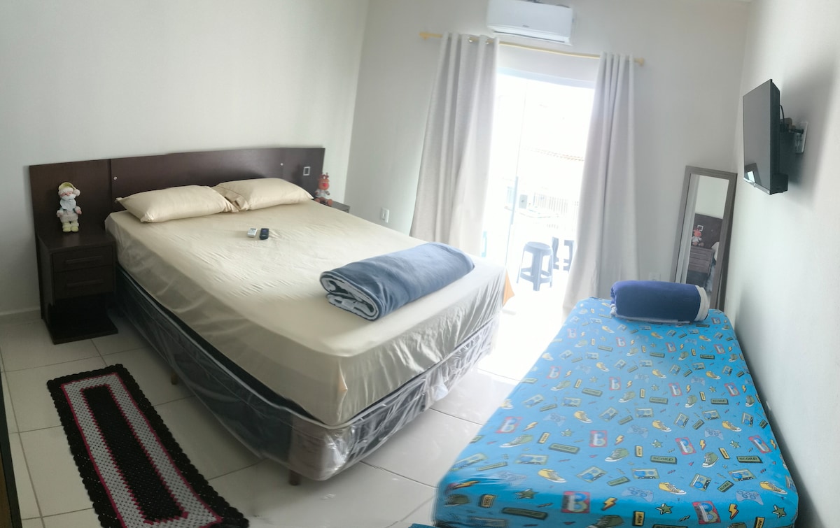 Hospede-se em uma casa de família! Suíte com banheiro privativo e equipada com uma cama de casal e uma bicama (quatro lugares no total), ar-condicionado, ventilador e guarda-roupa. Na área comum temos duas salas de estar e garagem. Localizada no centro, nossa casa está a 400m da rodoviária, 500m da feira de Aparecida, 800m da Basílica Velha e 1km do Santuário Nacional. Próximo a restaurantes, mercados, comércio e hospital. Minha família espera a sua!