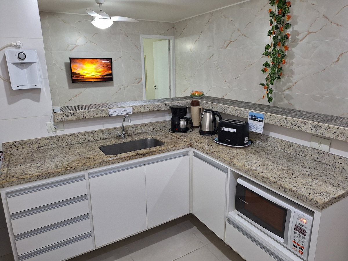 ¿Conoces ese lugar agradable, donde puedes descansar y disfrutar de la tranquilidad? Hermoso apartamento, recientemente reformado, con 2 dormitorios, 1 suite con cama king y colchón castor, baño social y cocina americana. El apartamento es súper acogedor, ventilado con vistas a la laguna. Está situado en una zona tranquila, arbolada y segura. Es recién reformado y todo es nuevo, completo en armarios, tiene aire acondicionado y televisión en los 2 dormitorios y sala de estar. Apartamento con cocina completa.