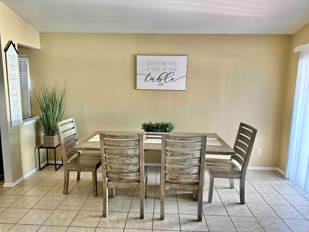 ¡Disfruta de un hogar lejos de casa! Esta casa está construida para una vida pacífica, con un plano de planta abierta. Sofá muy grande para sentarse en grupo, totalmente equipado con juegos de mesa, libros y novelas, una gran variedad de juguetes para niños, así como una gran cocina con electrodomésticos, utensilios de cocina, utensilios para hornear, etc. Las camas están equipadas con ropa de cama de lujo. Este terreno en esquina de una calle sin salida tiene vistas a Horseshoe Lake a lo lejos. Hay mucho aparcamiento en la acera, así como en la entrada y en el garaje. Asientos de comedor hasta 8, además de asientos de bar.