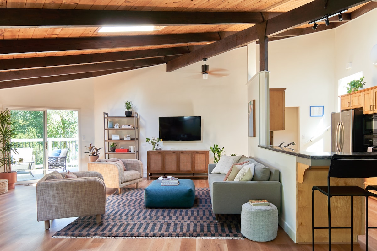 Featured by Sunset Magazine as a “chic escape,” this Peaceful Treehouse-style retreat blends mid-century design with natural materials like wood and stone for a calming, sanctuary feel. Light pours through floor-to-ceiling windows beneath soaring wooden beams, and Japanese-inspired sliding doors add to the architectural charm. Set high in the trees with ocean views, the home offers three elevated decks including one with a hammock - perfect for relaxing and enjoying the surrounding canopy.