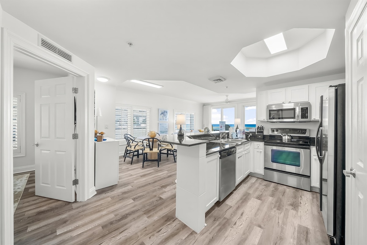 Condominio frente al mar con vistas panorámicas al Golfo desde la terraza, el dormitorio principal y la sala de estar. Capacidad para 6 personas. 2 dormitorios + habitación adicional con 2 camas individuales (sin armario), 2 baños. Remodelación de la cocina en enero de 2025 (fotos próximamente). Baño de invitados de 2024 con lavabos dobles, baño de spa principal de 2022 con ducha a ras de suelo con azulejos. A 10 minutos a pie de Pier Park. Lavadora/secadora HE, wifi privado, Smart TV de 70" con Hulu, Smart TV en todas las habitaciones. Debes ser mayor de 25 años; es posible que se requiera identificación. ** ¿No ves fechas que te vengan bien? Echa un vistazo a airbnb.com/h/nautical-nonsense9