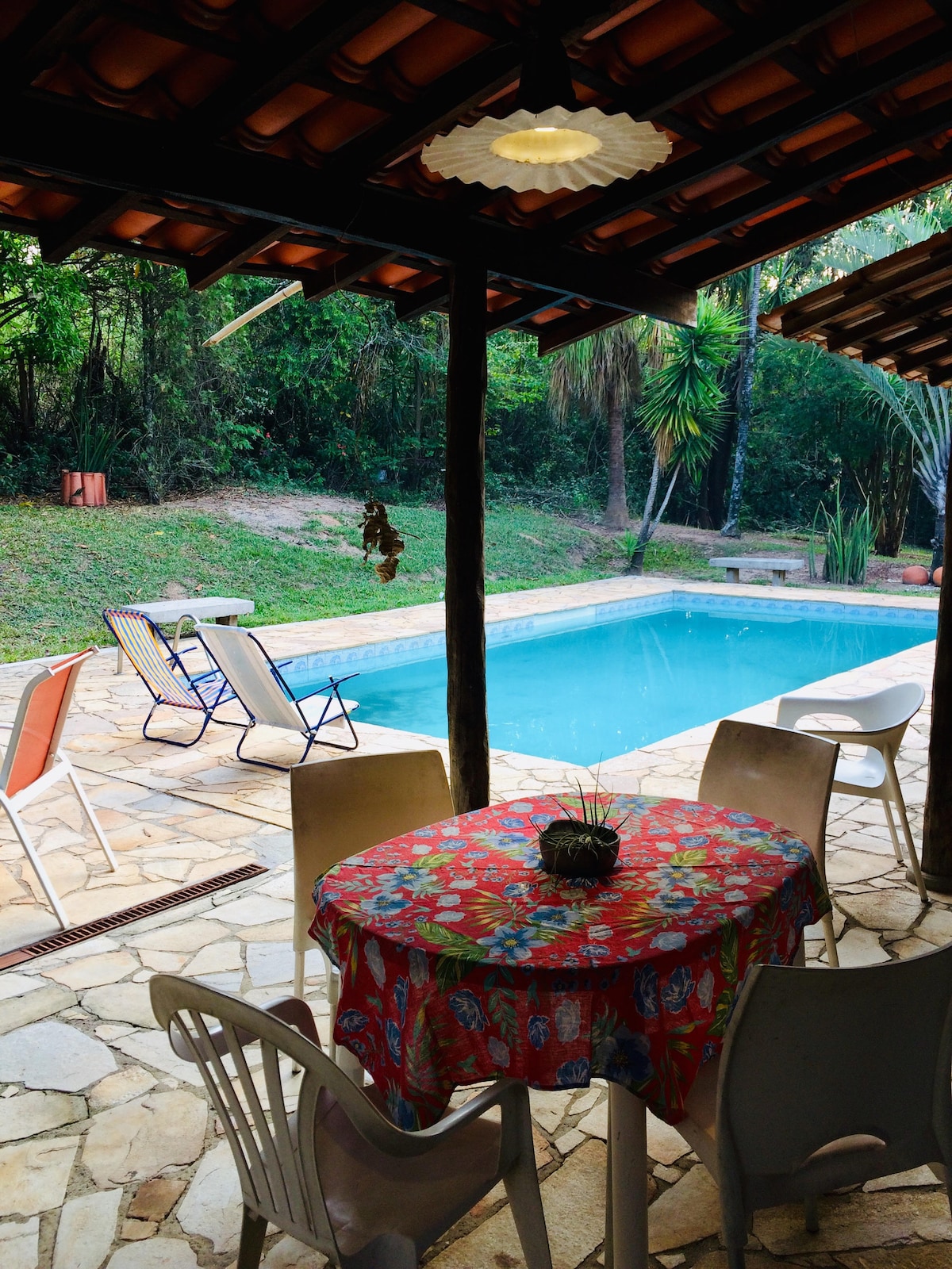 Villa con chimenea y jardín privado; lugar plano con mucha naturaleza alrededor; Disfruta de mañanas tranquilas en nuestro balcón soleado y la alegría de los momentos familiares, perfectos para un desayuno relajante con vistas al jardín y a la piscina, y disfrutando del canto de los pájaros; Alto Wall, seguridad para tu mascota; Internet wifi 480 mega de fibra óptica; Parrilla; Piscina con agua, luces; Ambiente familiar para toda la familia ; Ofrezco ropa de cama, excepto toallas de baño.