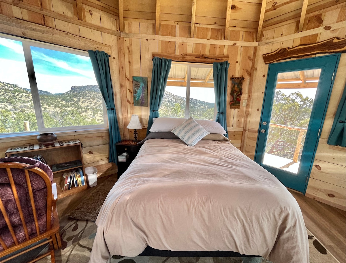 Shekinah Hermitage está a 8000 pies con vistas al norte de Cibola. F. Esta cabaña única mira hacia un cañón al norte y hacia el este sobre las llanuras de San Agustín. Rodeada de enebros y pinos piñoneros, es muy remota. Las ventanas que la rodean dan la sensación de estar al aire libre, pero la sólida estructura es inamovible en vientos fuertes. En el interior hay todo lo que necesitas, incluida electricidad limitada de 120 V con batería solar. Hay un baño adjunto con un inodoro de compostaje de aserrín. En el exterior, una plataforma elevada ofrece unas vistas espectaculares.