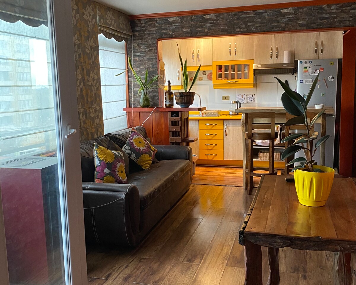 Departamento acogedor a 4 cuadras del centro de Temuco, ideal para parejas o viajes de trabajo. Decorado con pellines del Río Toltén y muebles de madera reciclada, combina diseño y calidez. Cuenta con cama King Rosen, espacio de trabajo, estufa a Pellet para inviernos fríos, mini balcón, 2 TV de 55”, cocina equipada y estacionamiento incluido. Cerca de Av. Alemania, Mall y Parque Isla Cautín. Todo caminando en minutos. Un espacio pensado con cariño para que te sientas realmente como en casa. ✨