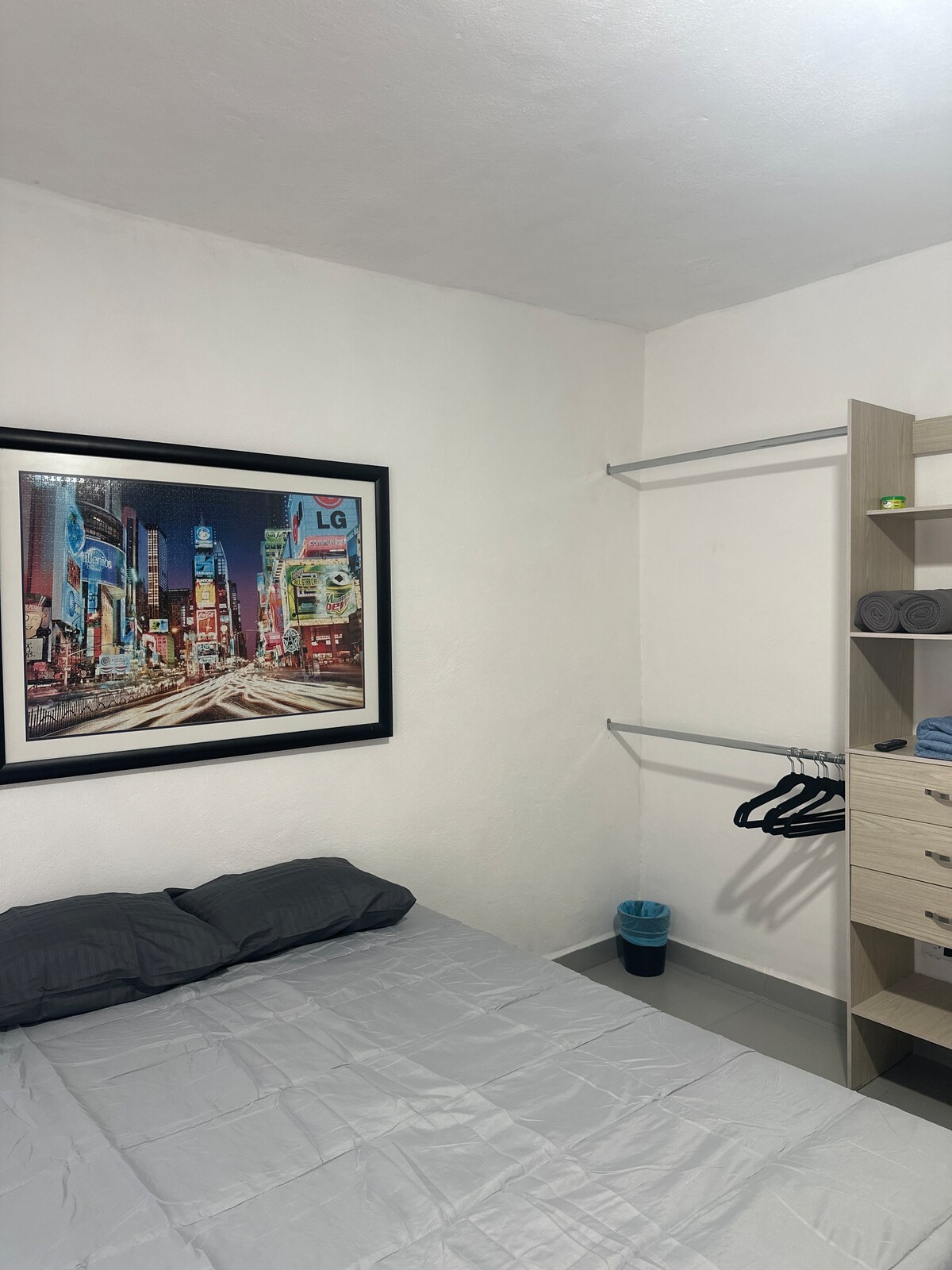 Departamento entero, en recámara tiene cama King Size y 2 sofá cama, aire acondicionado frio/calor, TV, closet y cajoneras. Además, tiene exclusivamente para ti: sala con 2 sofá cama, baño completo, barra comedor, cocina (con refri, estufa, micro ondas, horno, cafetera, nutribullet, sartenes, platos, etc.) Wi-fi rápido de 80MB, TV en sala.