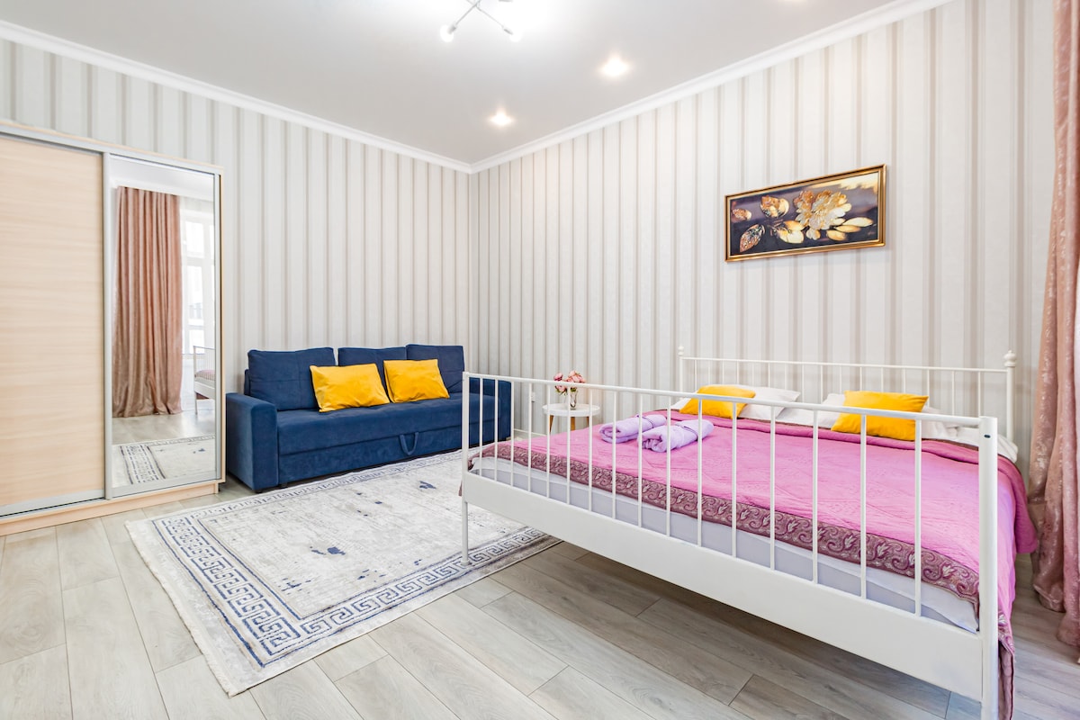 Apartamento nuevo cerca de los complejos deportivos Barys Arena, Astana Arena, Kazajistán, Velotrek Sary Arka. También hay un jardín botánico, un centro comercial, un restaurante y un gimnasio, y un supermercado cerca. Disfruta de una experiencia elegante en el corazón de la ciudad. Estoy seguro de que disfrutarás de tu estancia con nosotros, ya que nuestros huéspedes dejan excelentes reseñas. Estamos encantados de recibir a los huéspedes y siempre esperamos con ansias hacerlo.