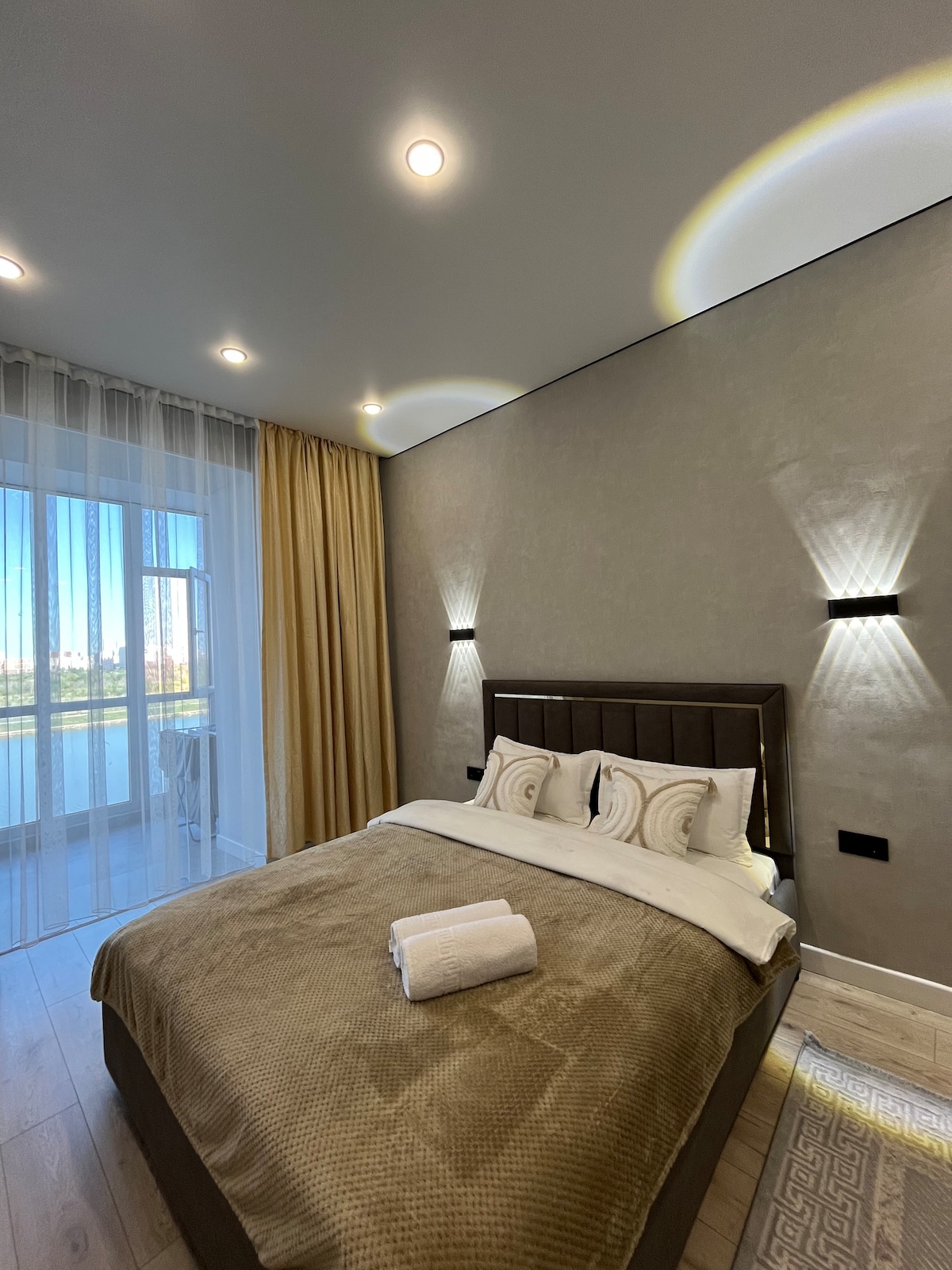 Complejo residencial de clase Premium Esil Riverside con una vista magnífica con vistas al terraplén del río Yesil. El departamento cuenta con: - Una cama grande de 2 camas. - Hermoso sofá plegable - Ropa de cama y toallas, champú, gel de ducha, jabón. - Televisión, internet de alta velocidad. - Lavadora - Tabla de planchar, plancha - La cocina está totalmente equipada con electrodomésticos y utensilios. Qué hay alrededor de hacer - El Circo - Parque acuático Ailand - Acuario - Parque del Triatlón - Ciudad de Keruen - Centro nacional de tenis