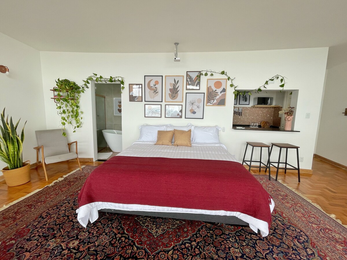 Apartamento tipo estudio en el piso 25 de Copán, el edificio más famoso del centro histórico, con vistas a la sierra de Cantareira. Pantalla de 100 pulgadas para ver tus programas favoritos (transmisión). Cómoda tina de baño para disfrutar de un relajante baño mientras ves la pantalla o contemplas la vista. Cama king size y aire acondicionado. Mesa de comedor para cuatro personas. Cocina totalmente equipada.